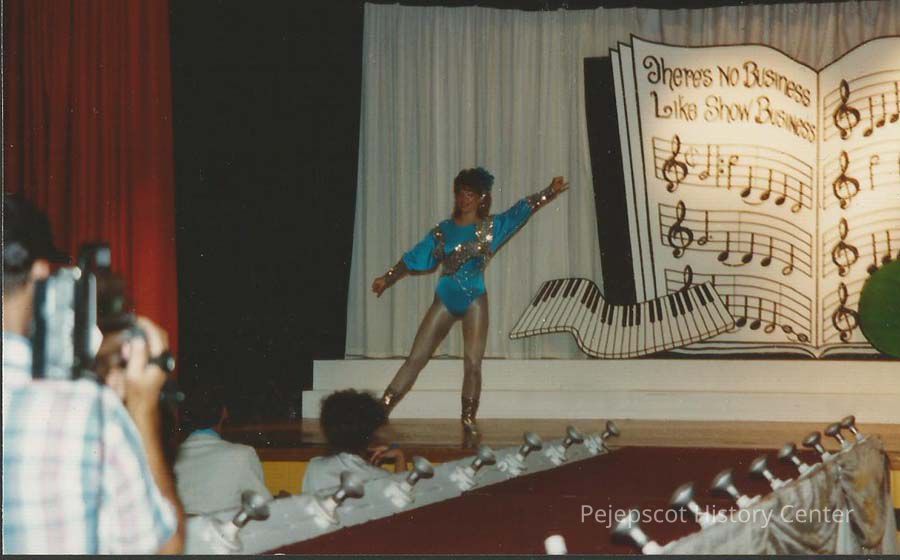 A color photograph of Lisa Kelly contestant number 3, at the end of her talent presentation,