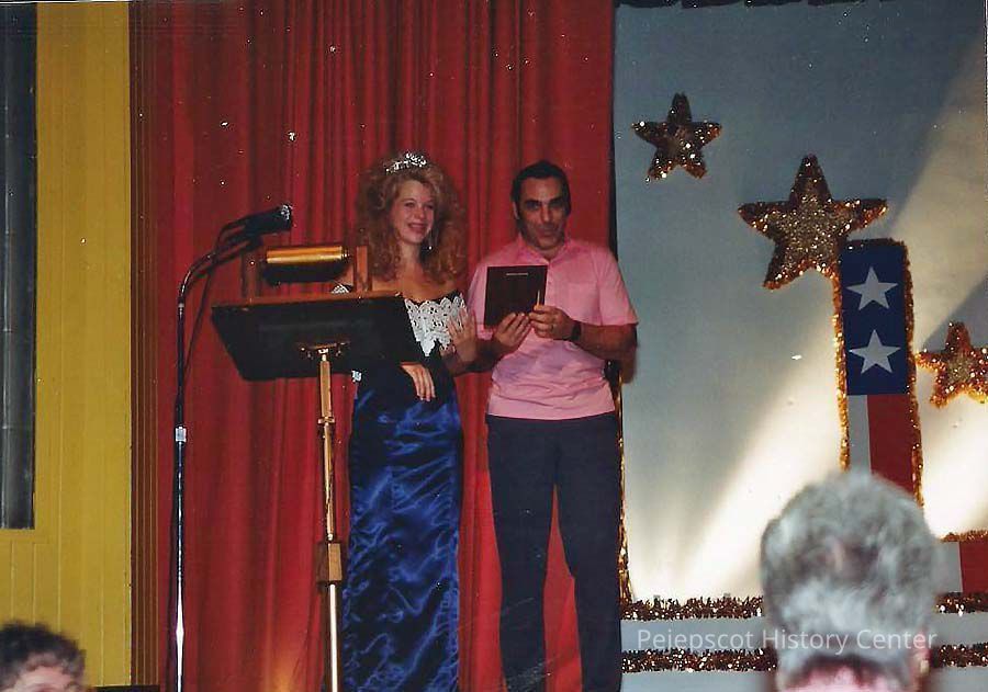 A color photograph of Lisa Kelly giving Camille Gagne the Pageant Award in the 1991 Brunswick Teen Queen Pageant.Collection