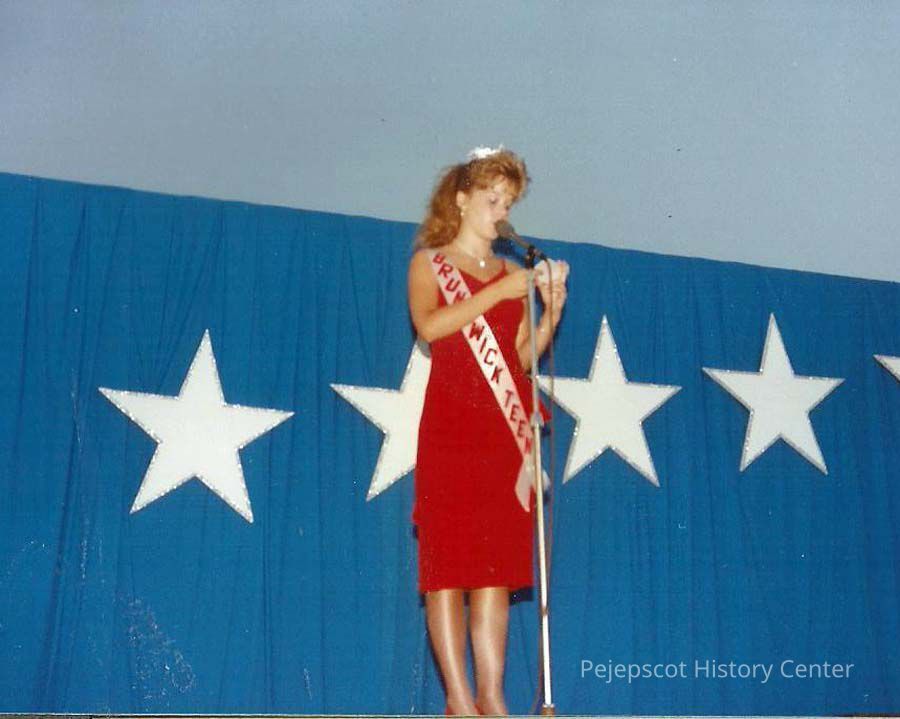 A color photograph of Lisa Kelly introducing her dance routine at the Topsham Variety Show. 8/12/1988.