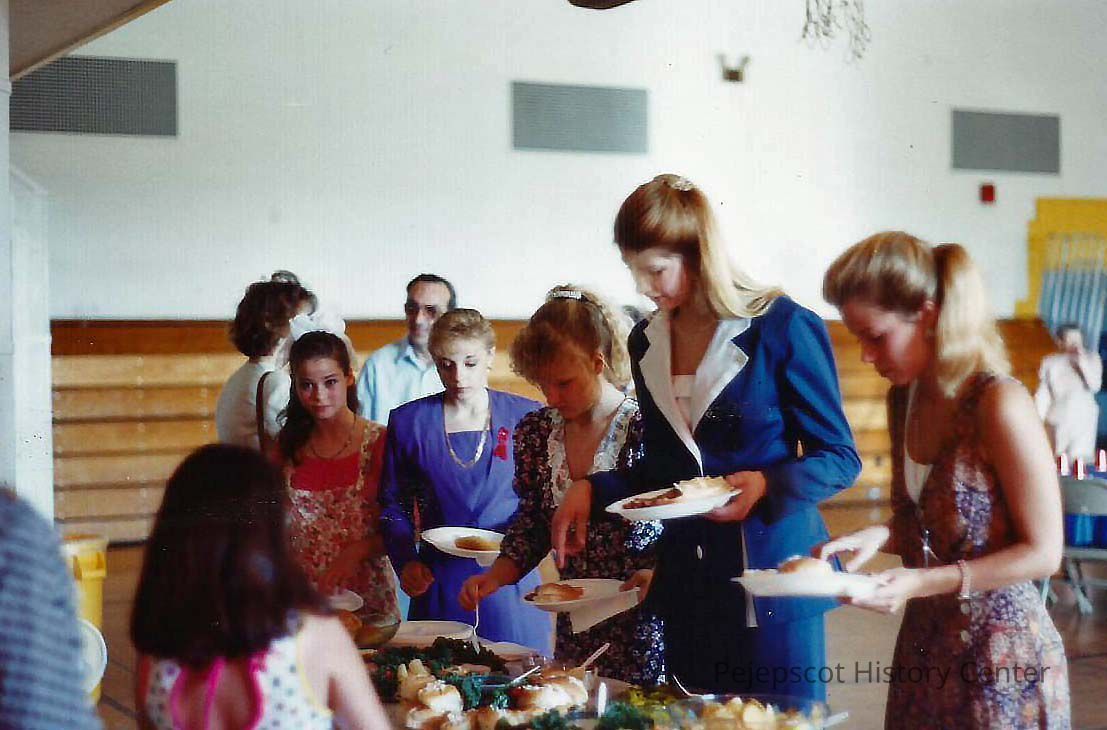 A color photograph of Lisa Kelly, Kristen Stevens, Michele Byras, Corrie Pottle and Mara Kane getting food.