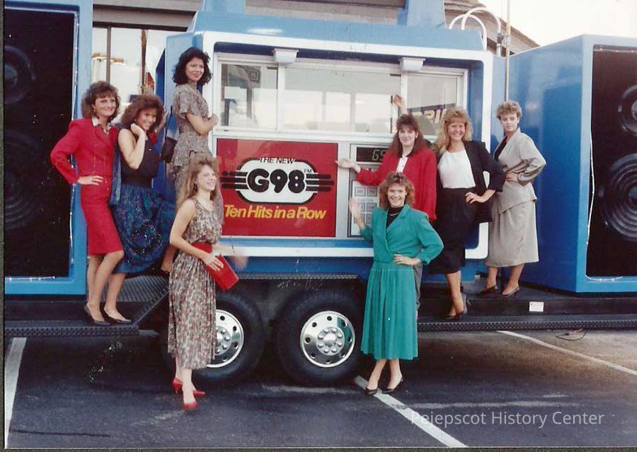 A color photograph of Lisa Kelly modeling with G98 radio station, Maine Mall Nissan. 7/18/1988
