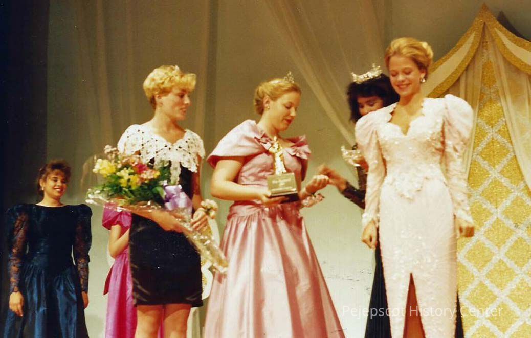 A color photograph of Lisa Kelly ready to be crowned by Katherine Albano.