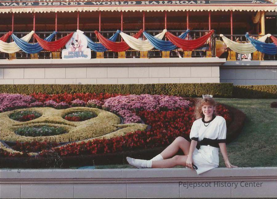 A color photograph of Lisa kelly relaxing by the flower garden at Disney World.