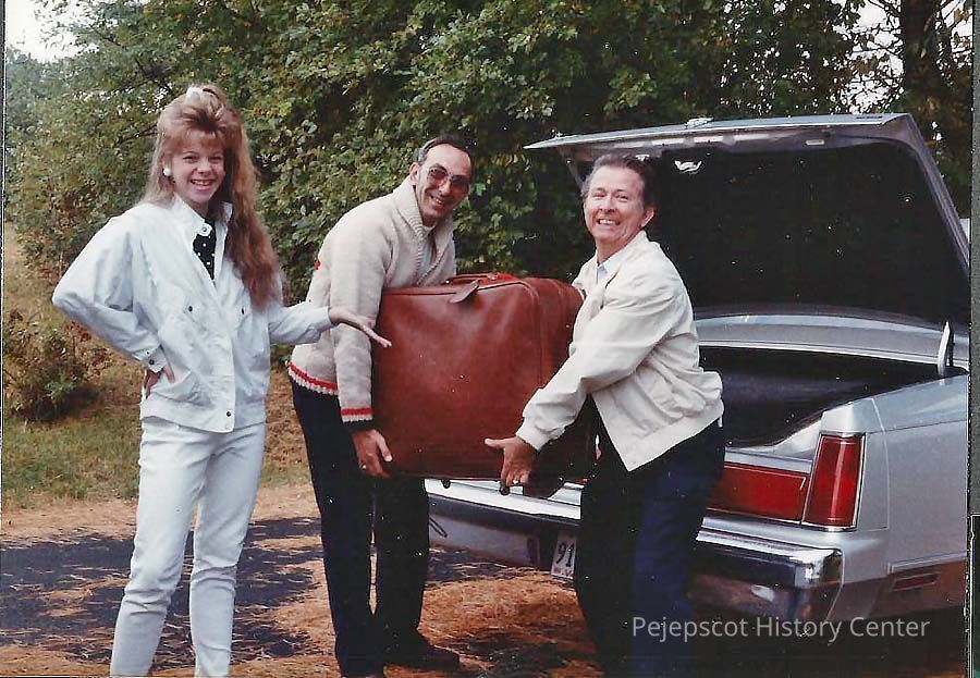 A color photograph of Lisa Kelly watching her father and Gene Gagne load her suitcase into the car. 10/10/1988