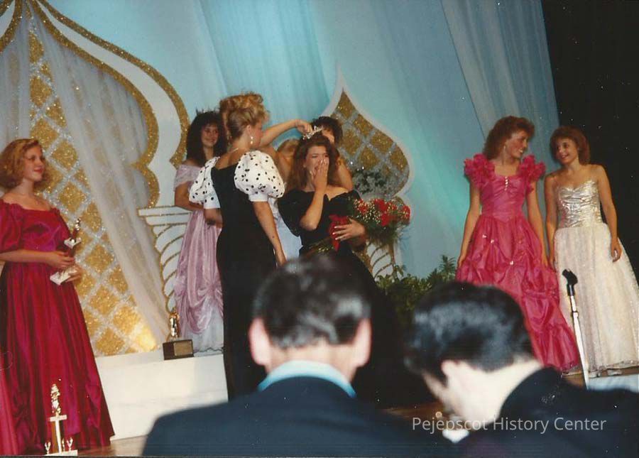 A color photograph of Lisa Kelly watching the crowning of Crystal Hurd at the 1990 Miss Maine Pageant.Collection