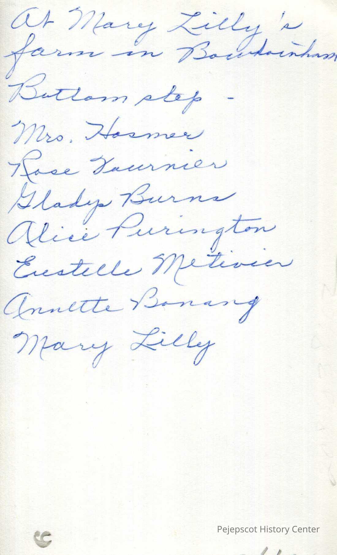 An undated listing of those individuals on the bottom step of a photograph taken at Mary Lilly's farm in Bowdoinham. They were employees of Brehaut's Store. The photograph to which this refers is labeled 1991.34.1a.
