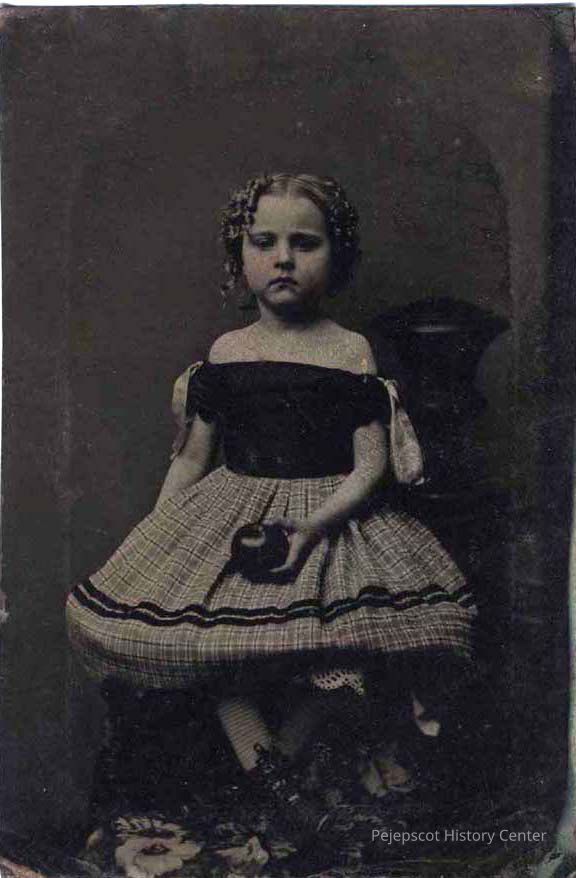 A B/W photographic view of a little girl holding an apple. Undated