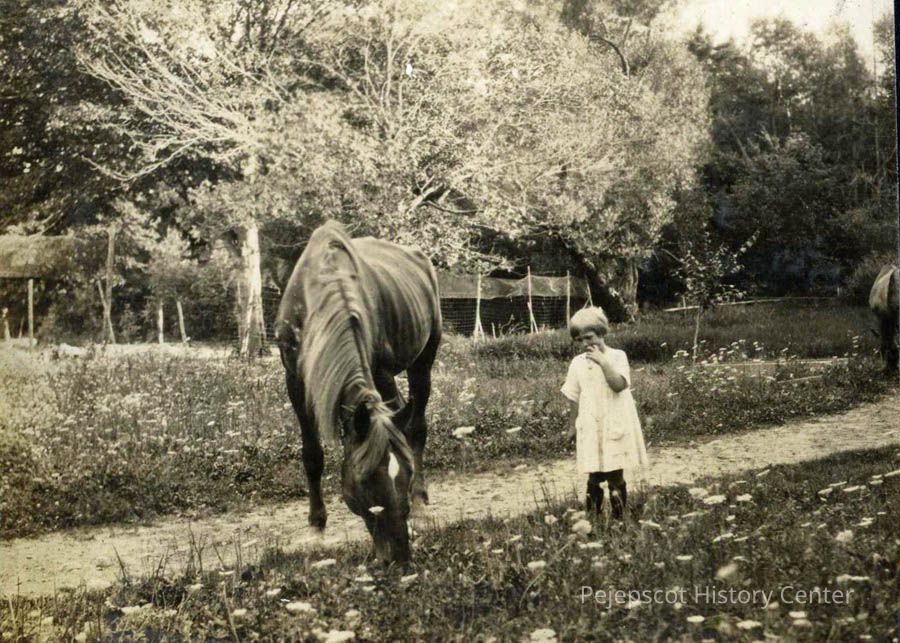 A B/W photograph of a little girl and a horse outside on a path. The horse is grazing in a field with flowers presumed to be in Harpswell, ME. Undated.