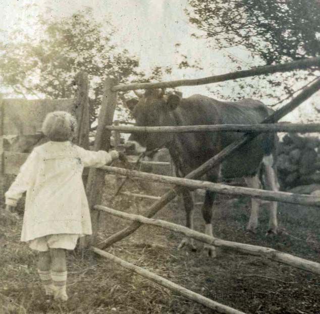 A B/W photo of a little girl feeding a cow behind an enclosure. Undated.