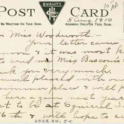 Dear Miss Woodworth - Your letter came this afternoon & it was most king of you to send me Miss Bascom’s letter. Thank you so much. We are much pleased with our choice of a summer place & will probably come here again next year. We expect to be at Squirrel Inn on the 16th & will hope to see you.