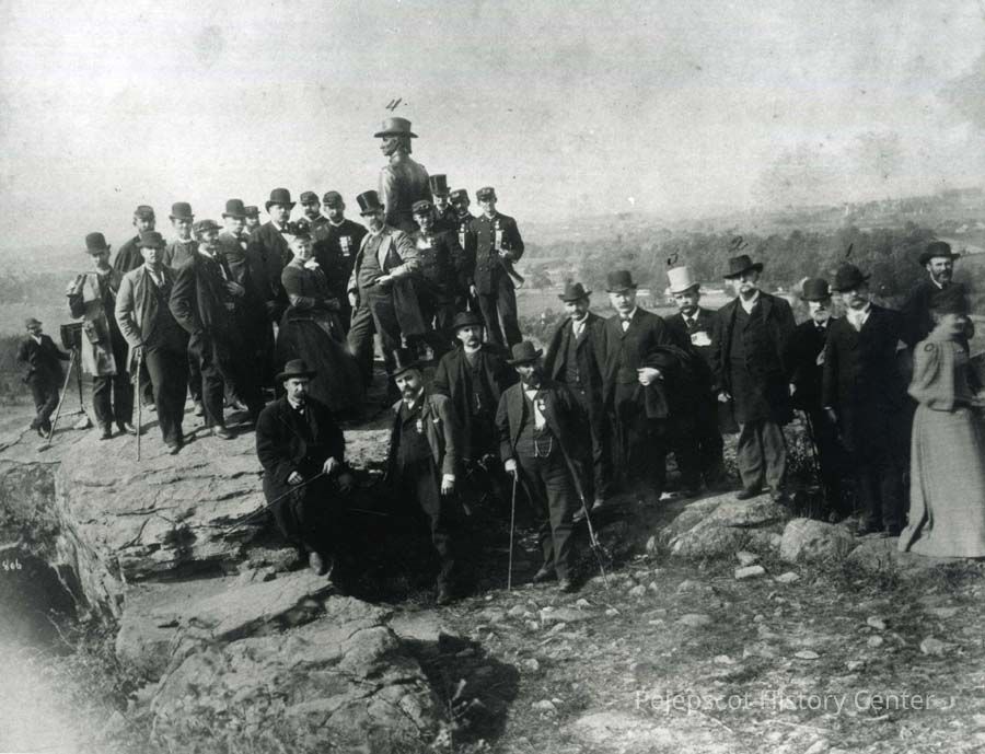 B/W photo of "A group of Maine Pilgrims visiting Little Round Top at Gettysburg". They include Joshua L. Chamberlain. The statue is of General Warren. 10/2/1889.Collection