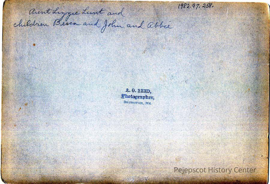 B/W photo of Aunt Elizabeh O. "Lizzie" Lunt (nee Woodside) and her children, Rebecca, John and Abbie. Elizabeth was the widow of Josiah Lunt, who died on March 29, 1865 during his service in the 20th Maine. From left to right: Rebecca, Elizabeth, John & Abbie.Lexicon
