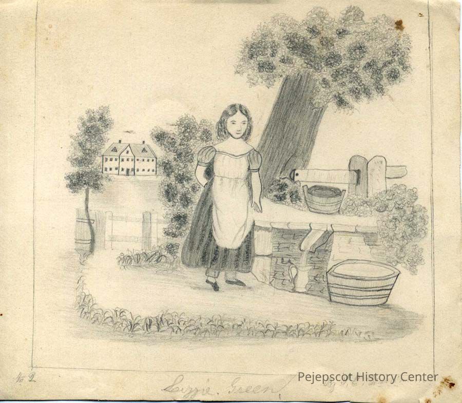 A monochrome pencil drawing on paper titled "Lizzie Green" by Sarah E. Quinnam. No Date.