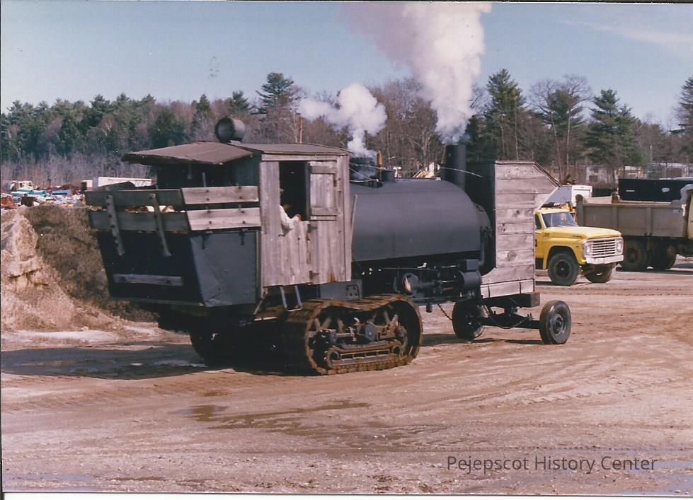 A color photograph of the Lombard Log Hauler in use. Smoke is visible rising from the hauler. Note on the back reads,