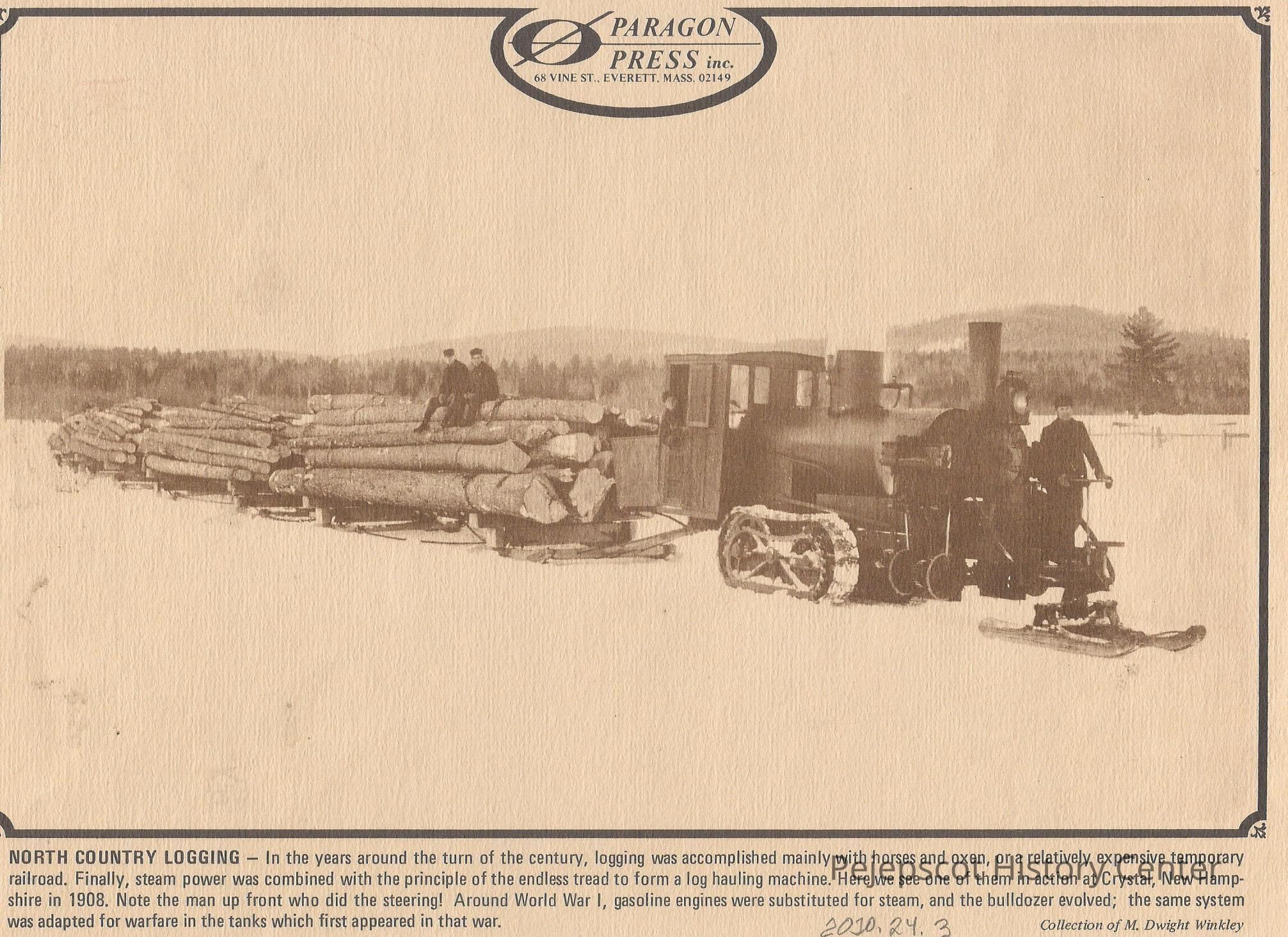 A color photograph of a newspaper clipping of a Lombard log hauler in use at Crystal, New Hampshire around 1908. The paper's name is entitled above the photograph as, "Paragon Press Inc." based in Everett, Mass. A short blurb below the photograph highlights the the accomplishments of the steam powered log hauling machine, before the move to gasoline engines following World War I. Dated 1908.