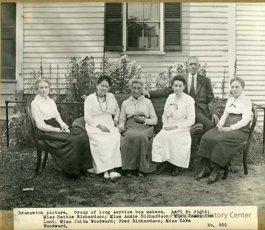 A black and white photograph of long service box makers from Brunswick sitting outside of a building. From left to right: Miss Hattie Richardson; Miss Annie Richardson; Miss Josephine Lunt; Miss Julia Woodward; Fred Richardson; Miss Cora Woodward. Undated
