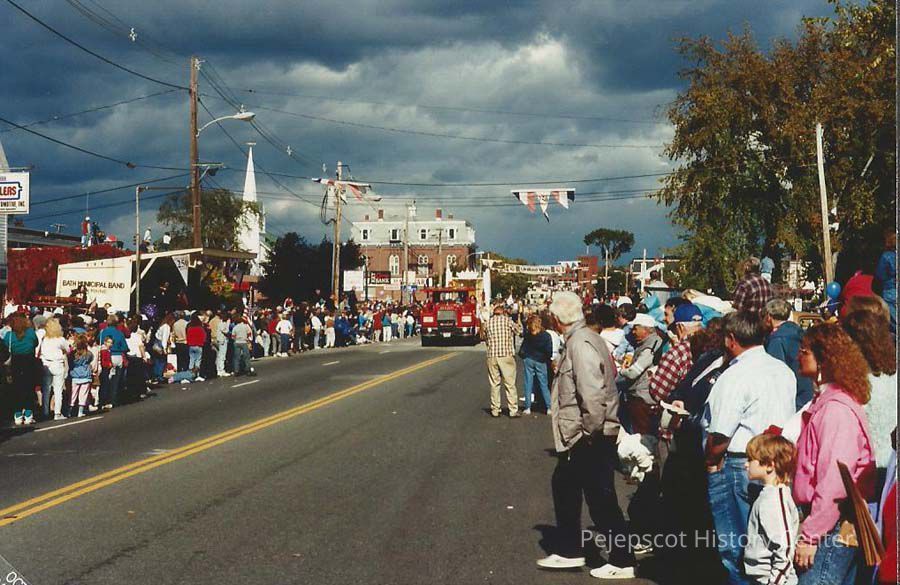 A color photograph looking down Maine Street at the coming parade. Cabot Mill can be seen in the background.Lexicon