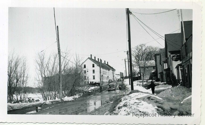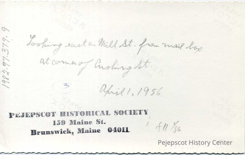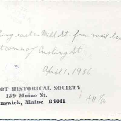 Looking east up Mill St. from mailbox at the corner of Cushing St., April 1, 1956. This is now (2010) the US Route 1 by-pass at the north end of Maine Street.