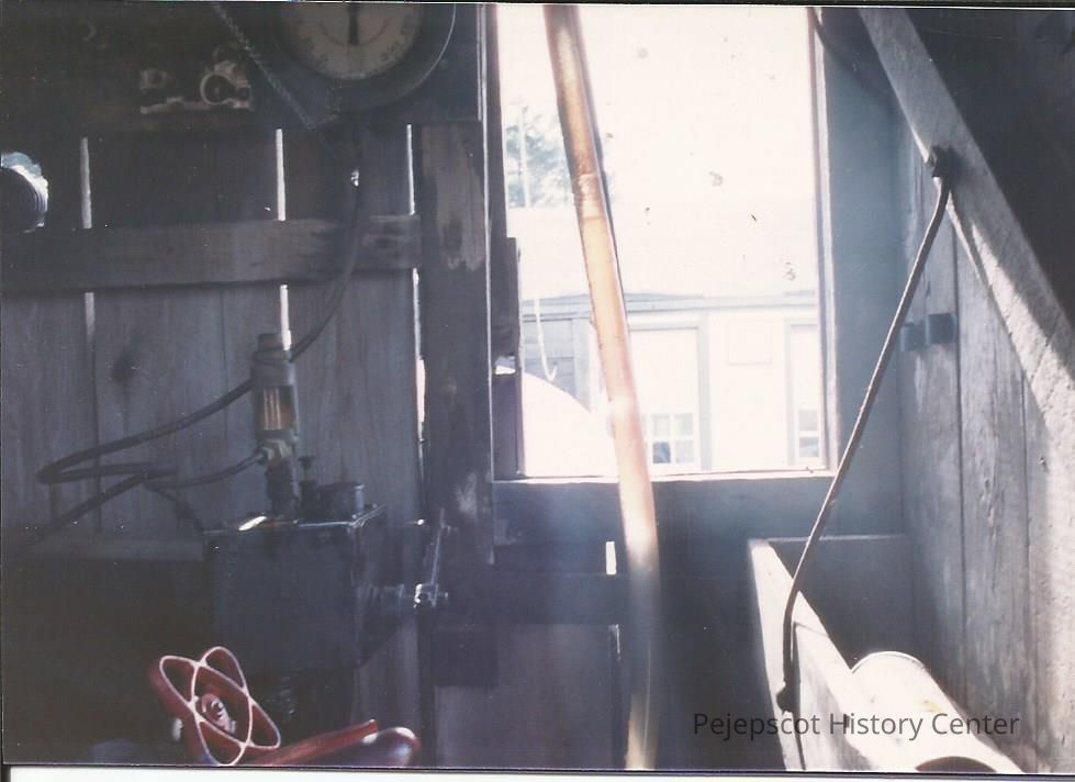 A color photograph looking out the right side window of the Lombard log hauler. The inner portion of the hauler is still in view as sun shined in the window. Writing on the back of the photo reads, "March 12, 1988 last running of the Lombard @ Harry C. Crooker's, Brunswick, Me before going to he Owls Head Transportation Museum." Dated 03/12/1988.Lexicon