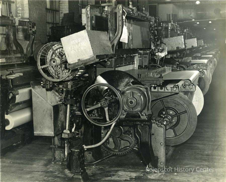 A B/W photograph of a loom in the Weave Room at the Verney Mill. Undated