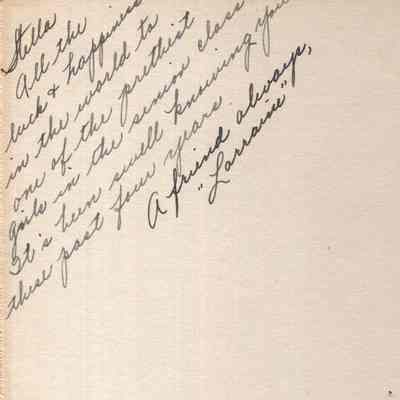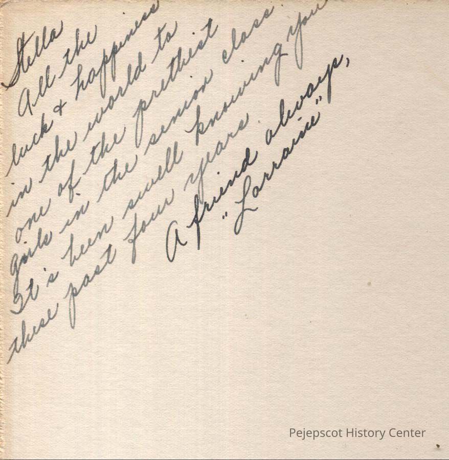 A B/W photograph of Lorraine Bouchard, Brunswick High School Class 1951. She gave the photo to Stella Purinton of the same class. Undated