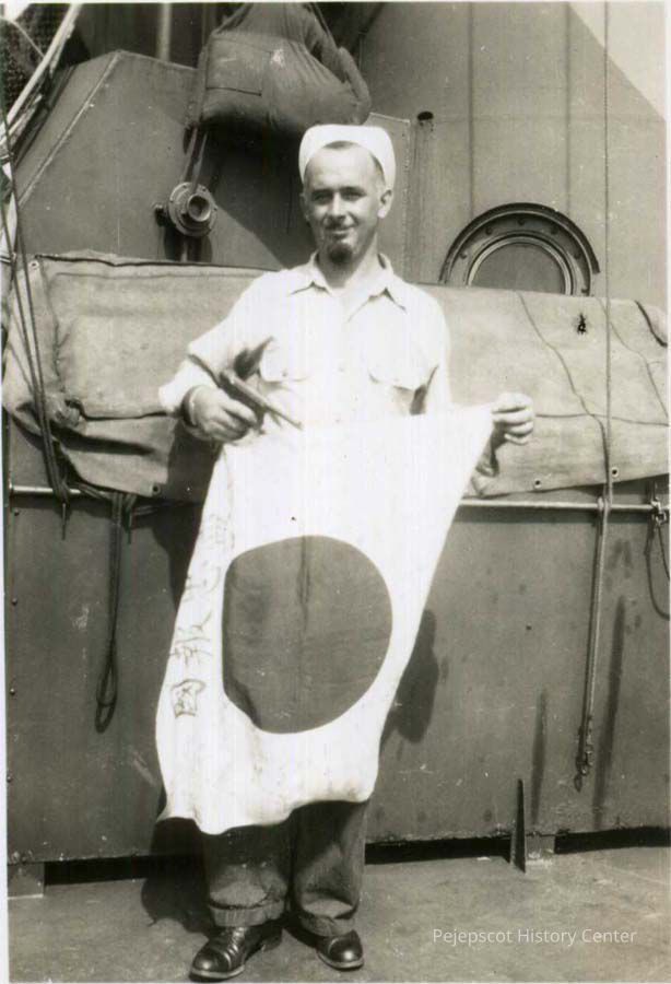 A B/W photograph of Louis C. Bernier holding a Japanese flag during WW II.