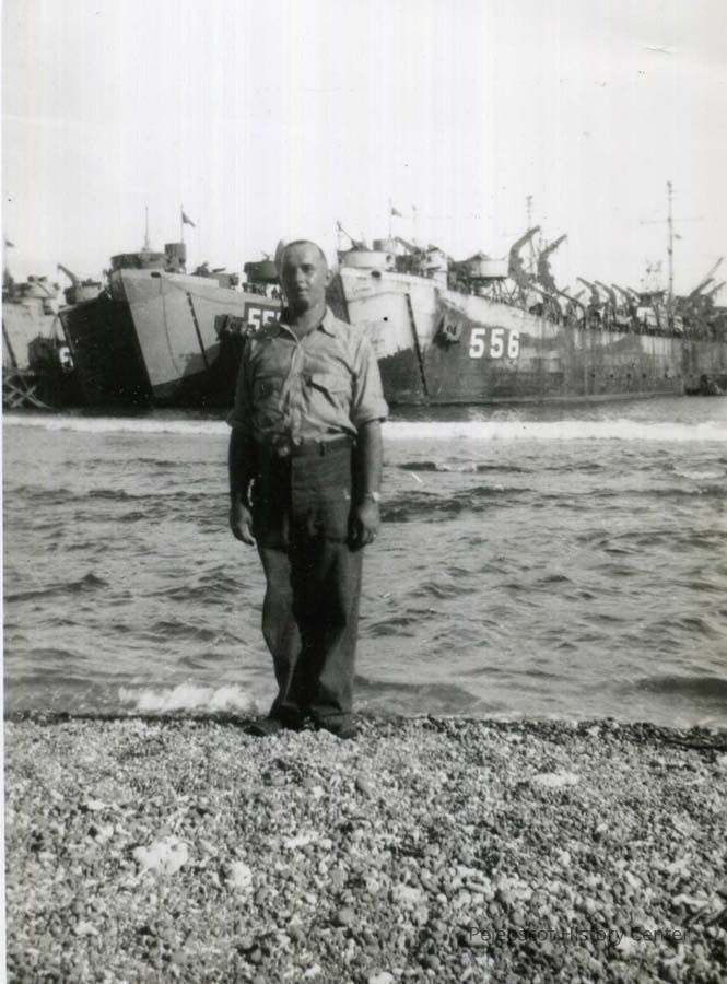A B/W photograph of Louis C. Bernier standing on shore with his landing craft ship behind him during WWII