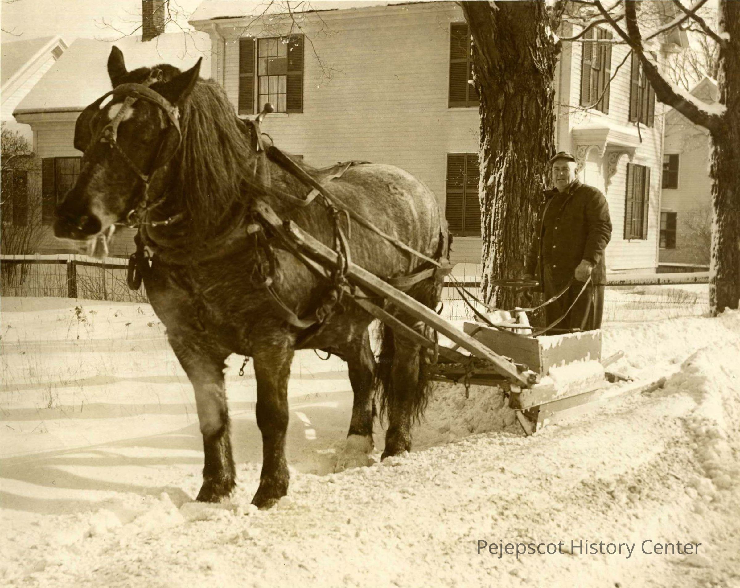 A B/W photograph of Louis Hasty plowing snow with a horse and wooden V-shaped plow in Topsham. Undated