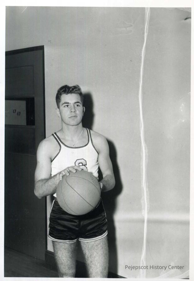 Black and white photograph of Louis Ouellette, BHS '55, basketball