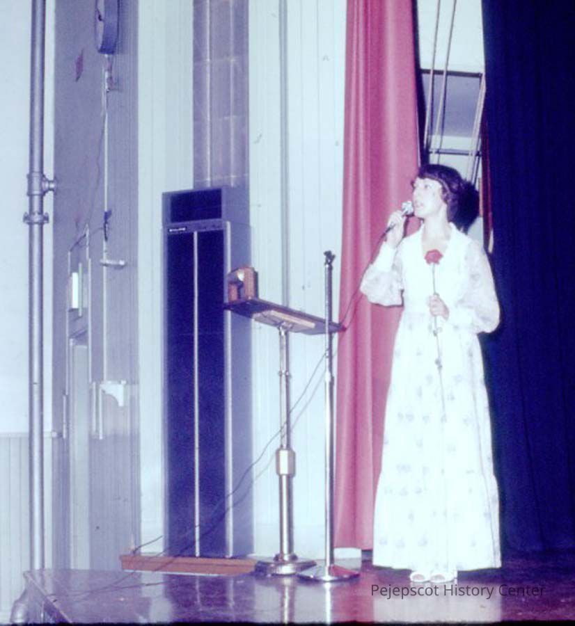 A 35 mm color slide of Louise Ouellette Caron singing at the 1977 Miss Teen Queen Pageant. The slide is marked, "Jul 77" and "5."