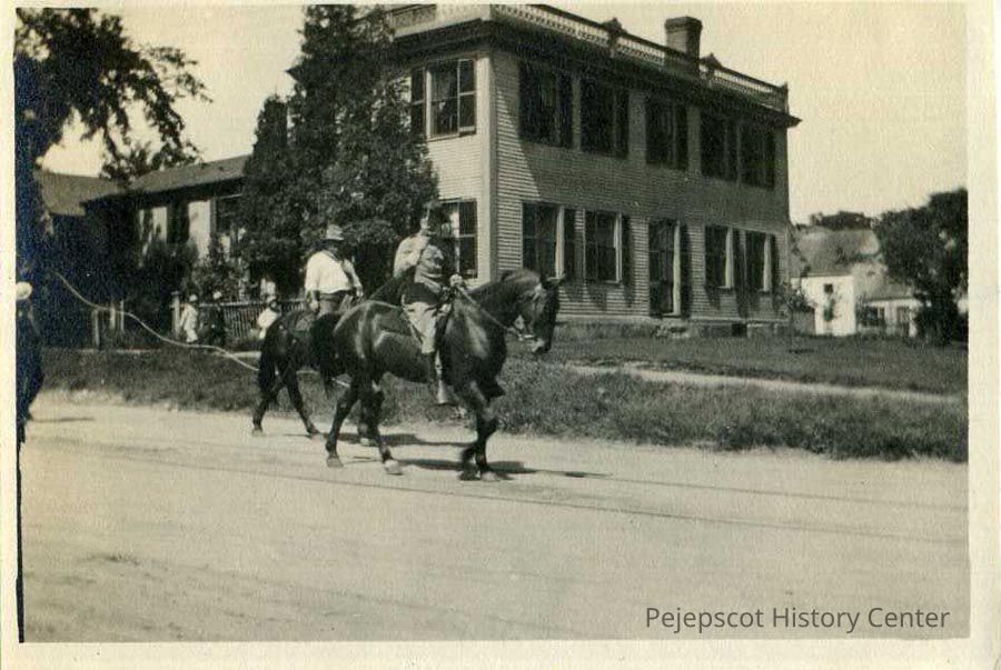 A black and white photo of two unidentified people on horseback in front of the Lovell House, also known as the Dunning House, at 36 Pleasant Street, on the corner of said street and Union Street.
