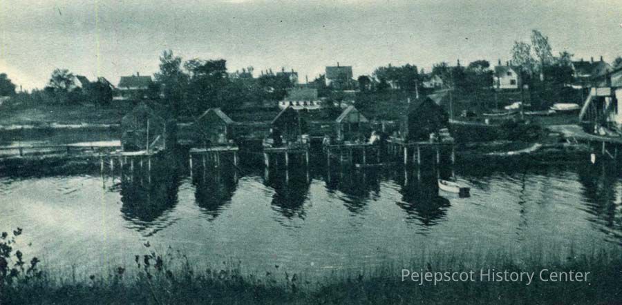 A B/W photograph of fish houses at Lowell's Cove, Orr's Island.