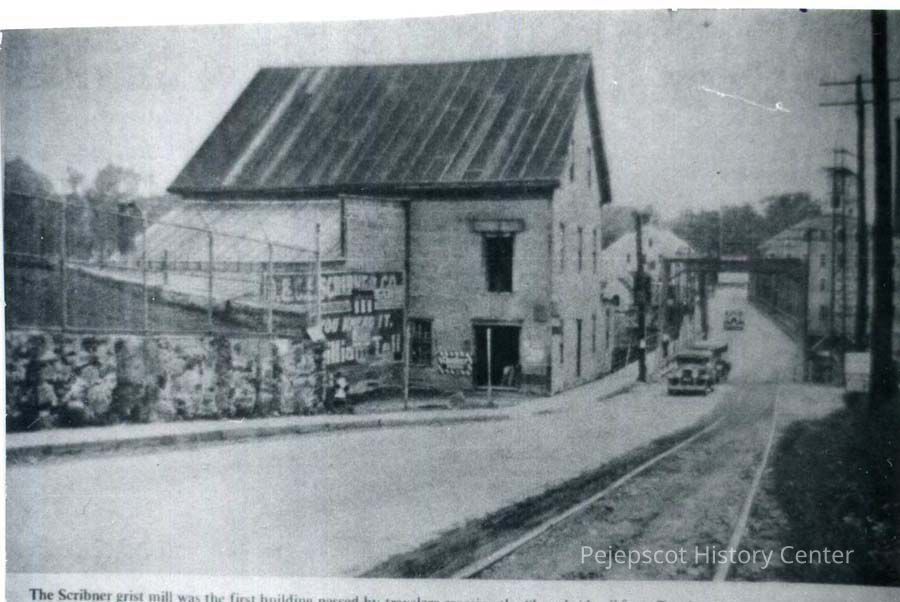 A B/W photograph of the lower end of Maine Street going on to the Brunswick-Topsham Bridge. Undated