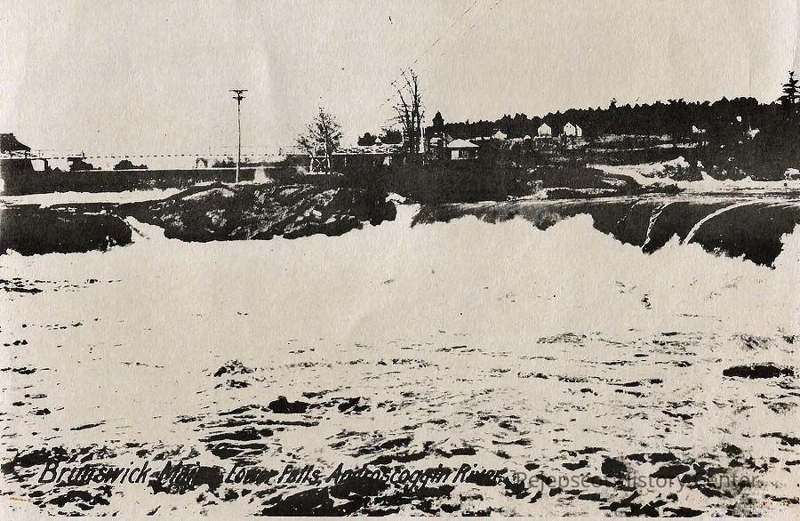 A B/W photograph of the Lower Falls in the Androscoggin River. The photograph has printed on it, "Brunswick, Maine Lower Falls, Androscoggin River" and written on it, "1906".Lexicon