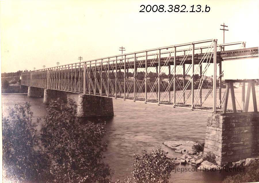 A B/W photograph of Lower Maine Central Railroad Bridge. This bridge was destroyed in the 1936 flood. Undated