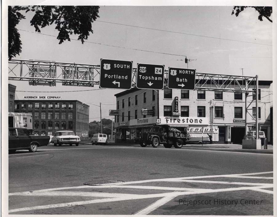 Photo of lower Maine Street looking toward factory buildings, which are topped with a sign reading "Auerbach Shoe Company". Block at southeast corner of Maine and Mason Streets at right, including a Firestone Tire store. Probably 1960s or 1970s, based on cars.