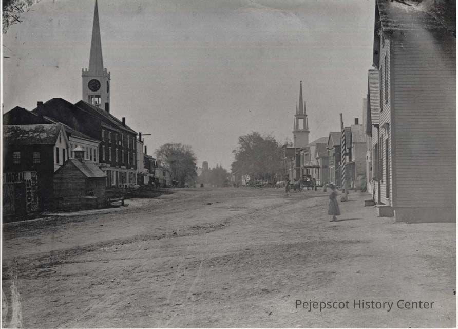 A B/W photograph of lower Maine St. looking south. The First Parish Church can be seen in the distance. Undated