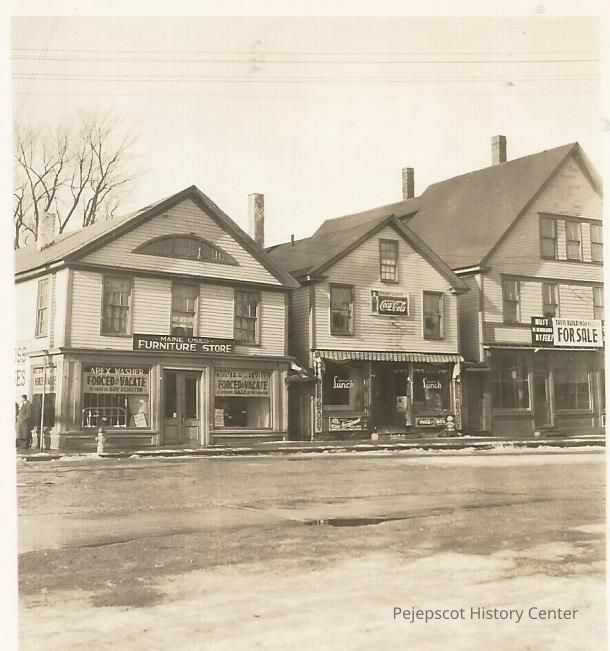 A B/W photograph of buildings on lower Maine Street, Brunswick, ME. The first store has a sign which says "Maine Used Furniture Store," and "Forced to vacate," the middle building has a Coca Cola sign and seems to be a lunch counter, and the last one is for sale. Undated.Lexicon