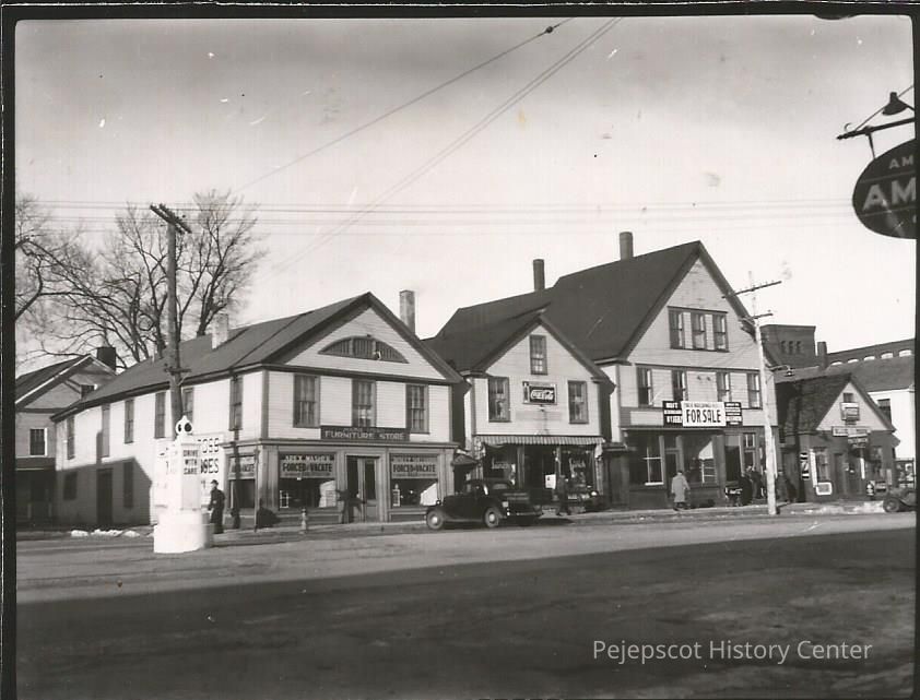 A B/W photograph of a section of lower Maine Street, Brunswick, ME. It shows 4 stores, one of which is for sale. Fort Andross (Cabot Mill) can be seen in the background. Undated.Lexicon