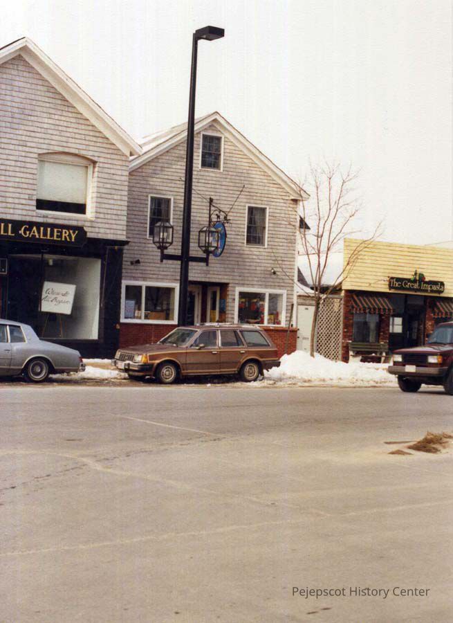 An undated color photograph of three storefronts on lower Maine Street. One is a gallery, one is the People and Pets store, and one is The Great Impasta.