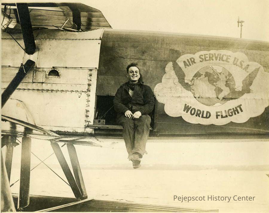 A sepia toned photo of Round the World Flyer Lt. Leslie "Les" P. Arnold aboard the Chicago, sitting and smiling beside sign on plane that reads: "Air Service U.S.A. World Flight".