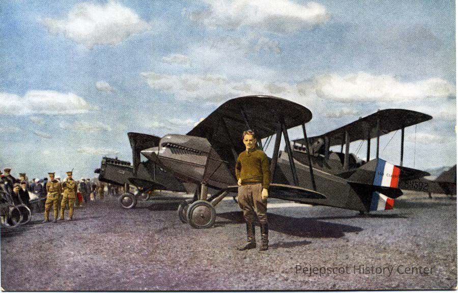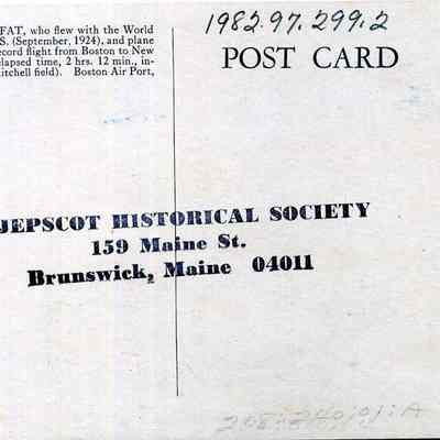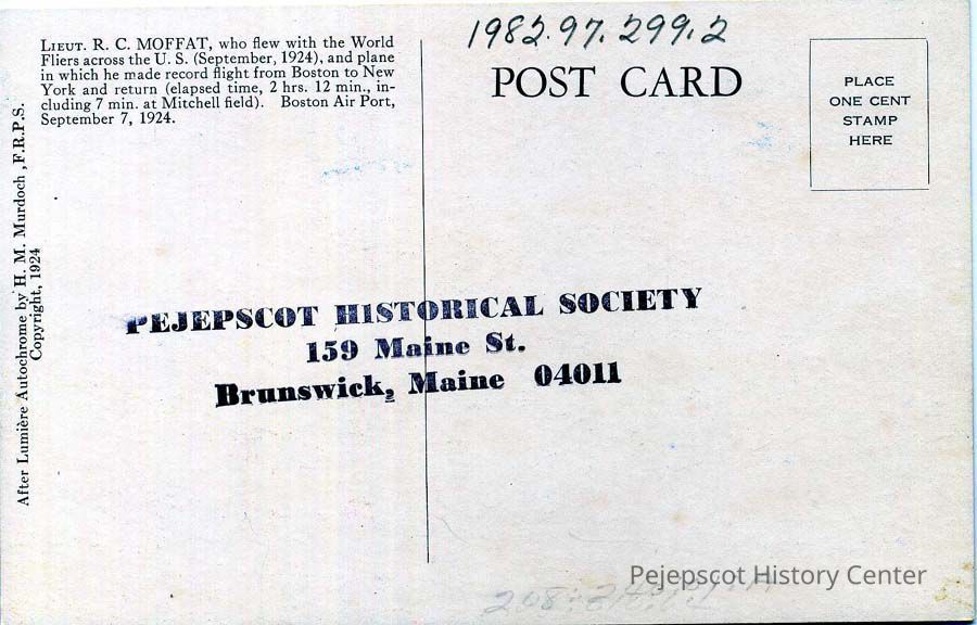 Color postcard of Lt. R. C. Moffat, who flew with the World Fliers across the U. S. (September 1924), and the plane in which he made the record flight from Boston to New York and return (elapsed time 2 hours, 12 minutes, including 7 minutes at Mitchell Field). Boston Airport, September 7, 1924.Lexicon