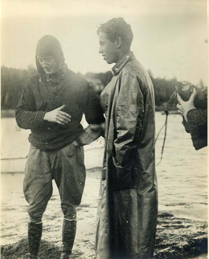 A sepia toned photo of Lt. Smith thanking Clarence Johnson for watching the Round the World Flyers planes landed at Mere Point during the night.
