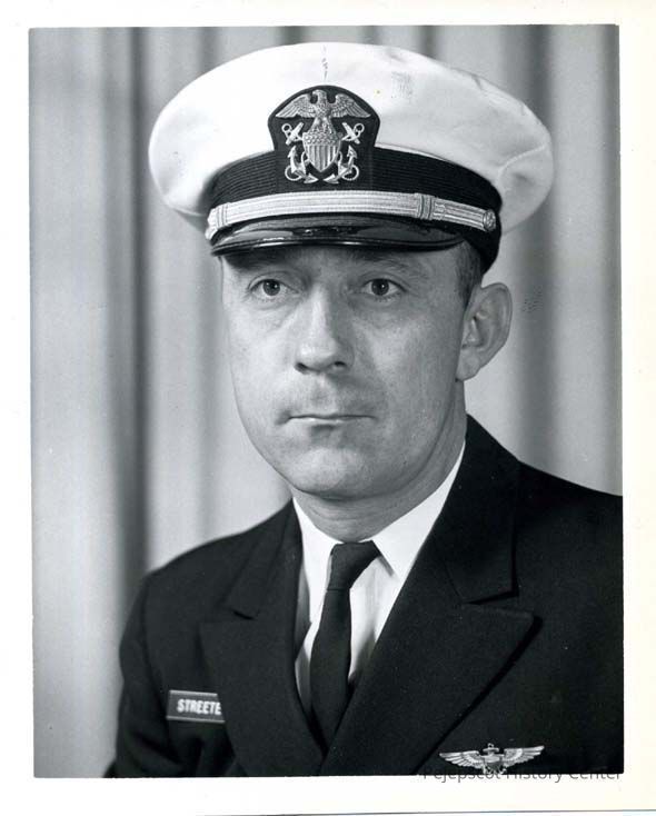 Head and shoulders portrait of Lt. Streeter, Ordnance. The back is stamped "U.S. NAVAL AIR STATION BRUNSWICK, MAINE AH 1611-10-63 OFFICIAL U.S. NAVY PHOTOGRAPH NOT FOR PUBLICATION UNLESS OFFICIALLY RELEASED." Undated