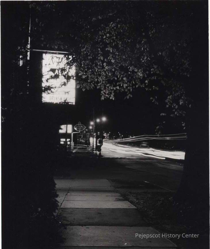 A B/W photograph of a sign which says "Lumbertown Brunswick." Undated