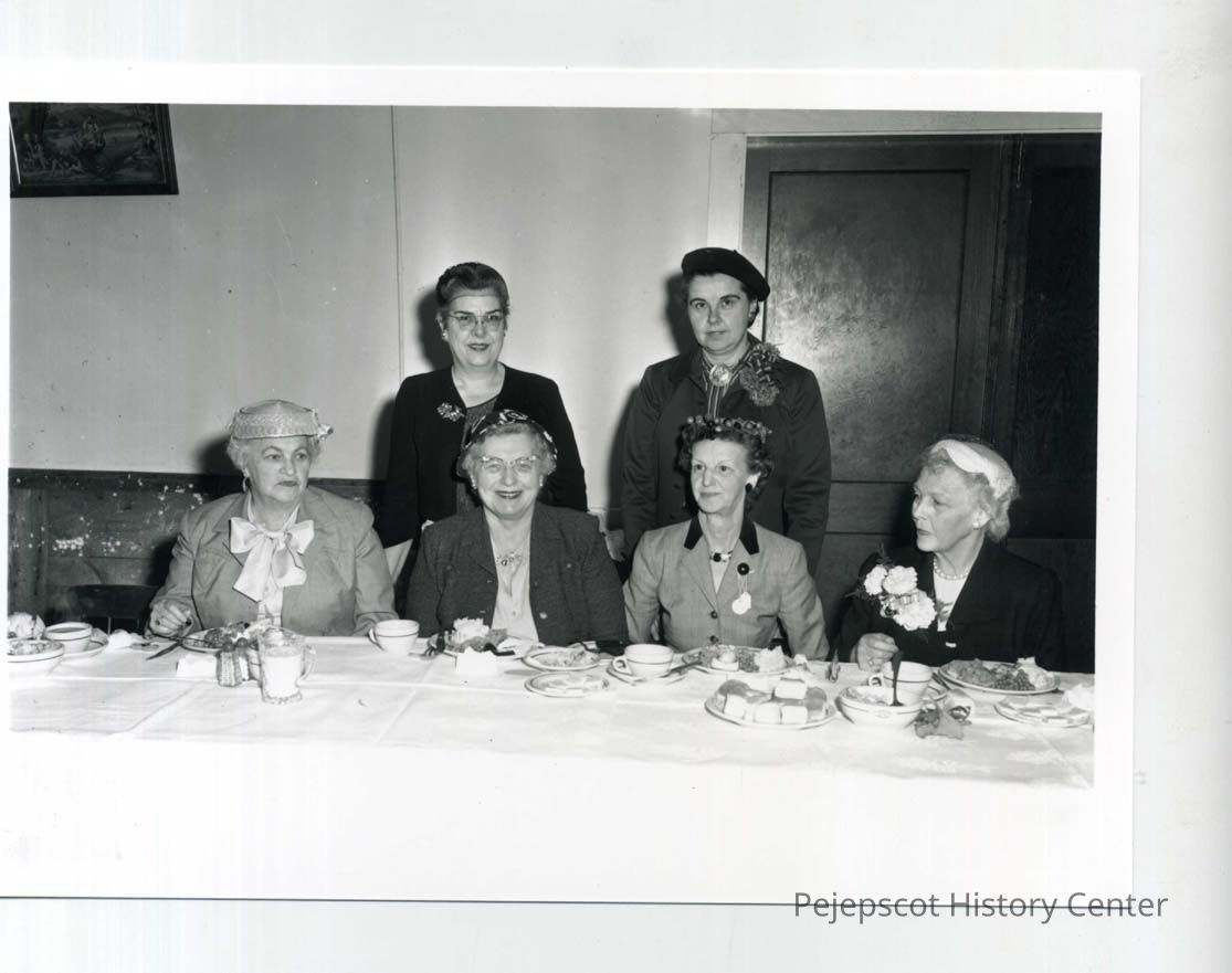 Six ladies sit and stand behind a table at a luncheon honoring Margaret Chase Smith.