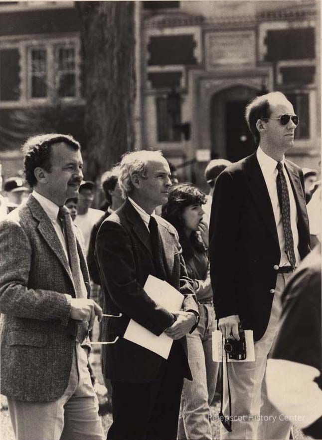 An undated black and white photo of Bowdoin College staff members, from left, Michael S. Parder, director of Security; Richard A. Mersereau, director of Public Relations and Publications; and Scott W. Hood, news director.Collection