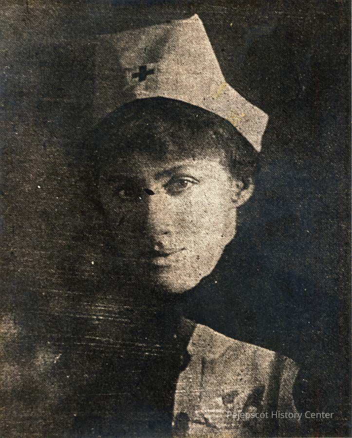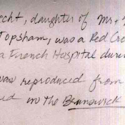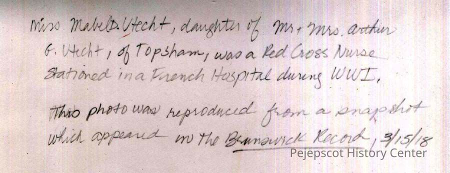 A B/W photographic reproduction of Miss Mabel D. Utecht daughter of Mr. & Mrs. Arthur Utecht of Topsham. She was a Red Cross nurse stationed in a French Hospital during WW I. This photo was reproduced from a snap shot which appeared in the Brunswick Record, 3/5/1918. Photo is undated.