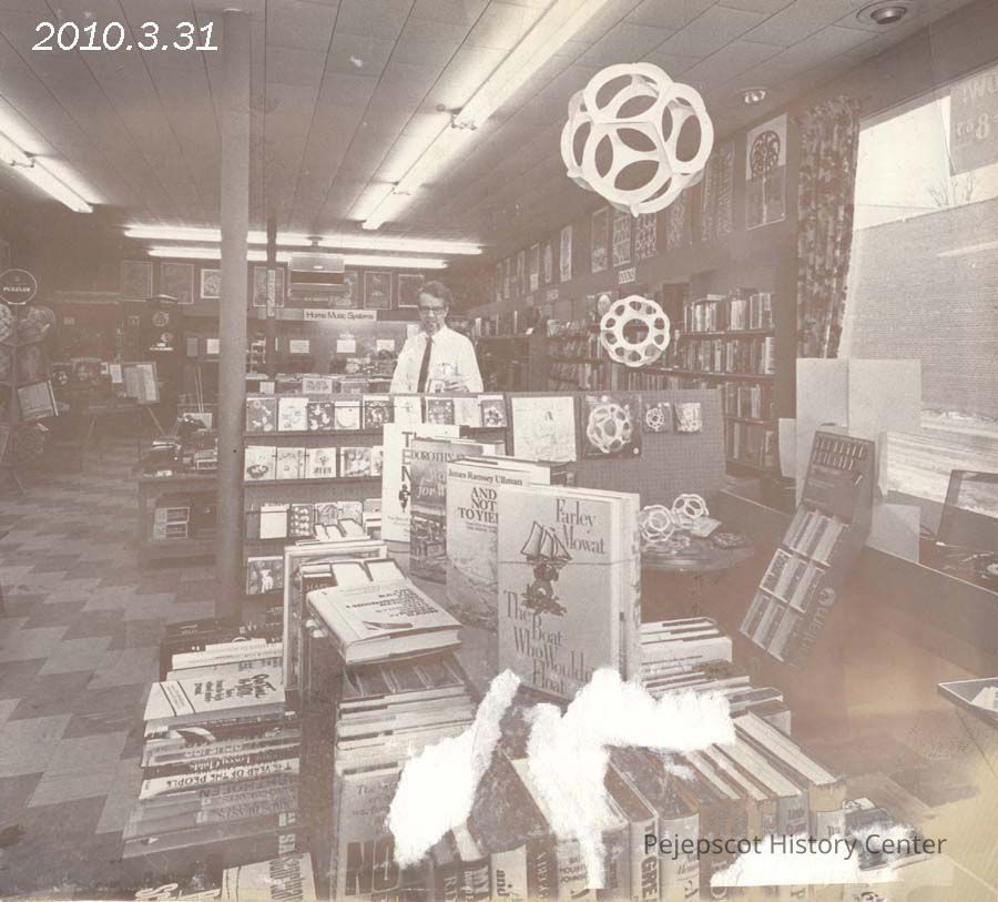 A B/W photograph of the interior of Macbean's bookstore, 54 Maine Street after it had undergone extensive renovations. In the background in this photo is Randy Macbean. This photo was published on March 25, 1970 page 4 under "Award winners." Undated