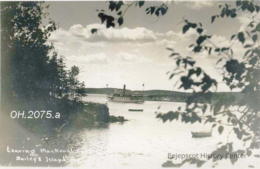 A B/W photograph of a boat leaving Mackerel Cove, Bailey Island, Maine. Not dated.